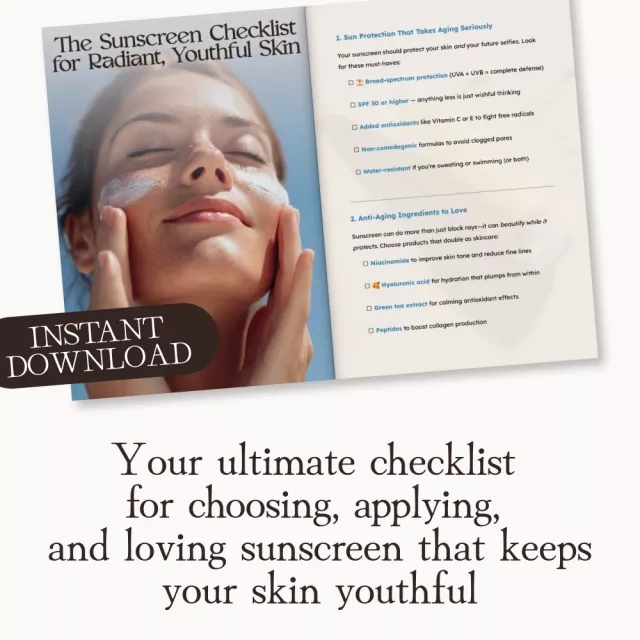 Say goodbye to guesswork and hello to confidence every time you shop for sunscreen. The Sunscreen Checklist for Radiant, Youthful Skin is your digital guide to choosing products that protect, nourish, and preserve your glow. Whether you’re 25 or 65, this beautifully designed checklist breaks down what to look for in a sunscreen for aging skin — so you can make smarter skincare decisions in minutes, not hours of scrolling reviews.